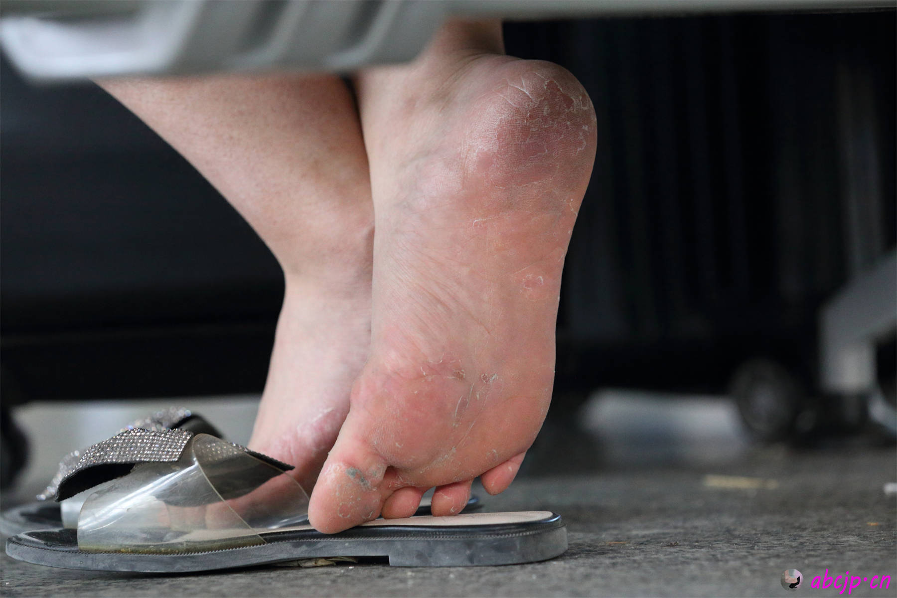 虽然打扮简约但总给人一种高贵的气质,她个性看起来有点高傲,估计她是有资本才这么高傲哦.当她大尺度踮鞋并且交叉方式呈现脚底时候竟发现她的脚底是多么性感的,红润的脚底肤色很养眼,如果你不是近距离细看,你是很难察觉他脚底是有死皮和脚气的,红润的脚底大伙都误以为脚底应该水润健康,但结果相反,红润至于居然还有脚气死皮,这多么让人兴奋啊,踮脚姿势并非一成不变哦,时而用脚趾弯曲合拢脚底姿势踮脚,时而脚心外翻大秀脚心的美,可以看出这姑娘的脚底味道真的好浓.就脚面方向看她的脚丫边缘其实也有脚气和死皮的,仿佛这给姑娘一个警告,再不治疗这脚气恐怕要往中晚期脚气方向发展了.