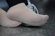 (袜子)清秀丽质可人的眼镜美女生脱掉黑色运动鞋露出白色棉袜子美脚,柔软纤薄修长的脚型太好看!36张