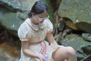 (袜子)花裙装丽人大秀她白色短棉袜子美脚,脚型太好看了,蓝衣丽人选择腼腆秀黑色棉袜子美脚,气质不一样其实是两姊妹!86张