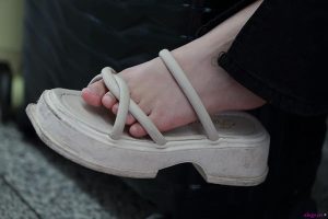 (平底鞋)眼镜青春姑娘的厚底平底凉鞋玉足好白皙粉嫩啊,完美无瑕,皮肤太好看了,鞋子脏脏的,脚丫却干净的!26张