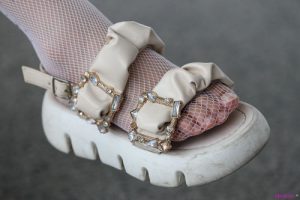 (网袜平底鞋)梦幻公主装喜欢买轻奢品的时尚丽人,别具一格的打扮,长款白色网袜美腿搭配厚底奶白色平底凉鞋,既罕见又性感!65张
