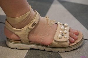 (丝袜平底)好可爱的姑娘,凉鞋配超薄短丝袜,丝袜太薄了,右脚的丝袜已被撕破了,可见她的脚丫多么嫩,脚趾多么美!58张