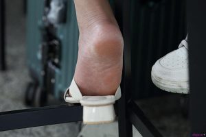 (裸足)白衣女郎按捺不住寂寞脱掉白色凉鞋露性感柔软的美脚,脚面真好看,还来一个勾魂的交叉脚踮脚露脚底,脚底好红润漂亮啊!46张