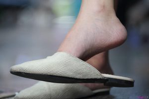 (平底鞋)黑色OL装却搭配厚底拖鞋的年轻丽人,脱掉鞋露红润漂亮的玉足,微略在踮鞋秀脚底,肤色相当好!52张
