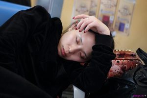 (袜子)坐姿很痞的年轻美女脱掉粉红色运动鞋露出的短棉袜子还是粉红色的,娇小玲珑的脚型!49张