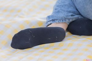 (袜子)戴帽青春姑娘脱掉鞋露白色短棉袜子美脚活泼地秀起来,袜子脚底原味脏兮兮的!95张