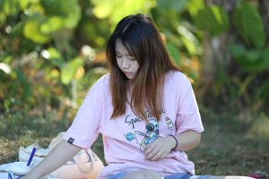 (袜子)淡蓝装美女大学生脱掉国际象棋款帆布鞋露白色短棉袜子美脚,伸直双脚秀性感的美脚底!53张