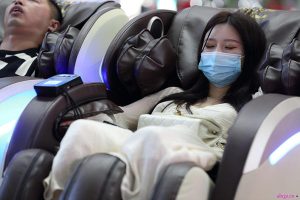 (袜子)年轻丽人脱掉商务高跟坐在按摩椅上秀她米黄色船袜美脚,脚面很嫩保养很好,船袜很干净!47张
