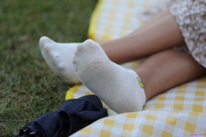 (袜子)年轻漂亮的白衣裙装美女脱掉厚底白色帆布鞋露白色船袜子美脚,脚型标准好看,够纤瘦,袜子很白皙干净!39张