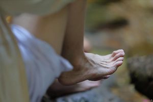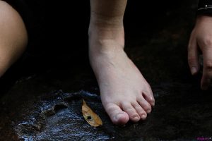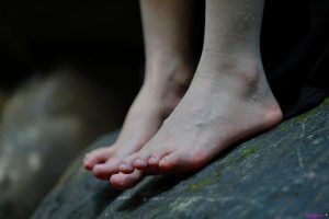 (山水裸足)眼镜少妇独自坐在一块大石头上踮着美脚秀脚面,踮脚姿势好美啊,脚丫保养很好!23张